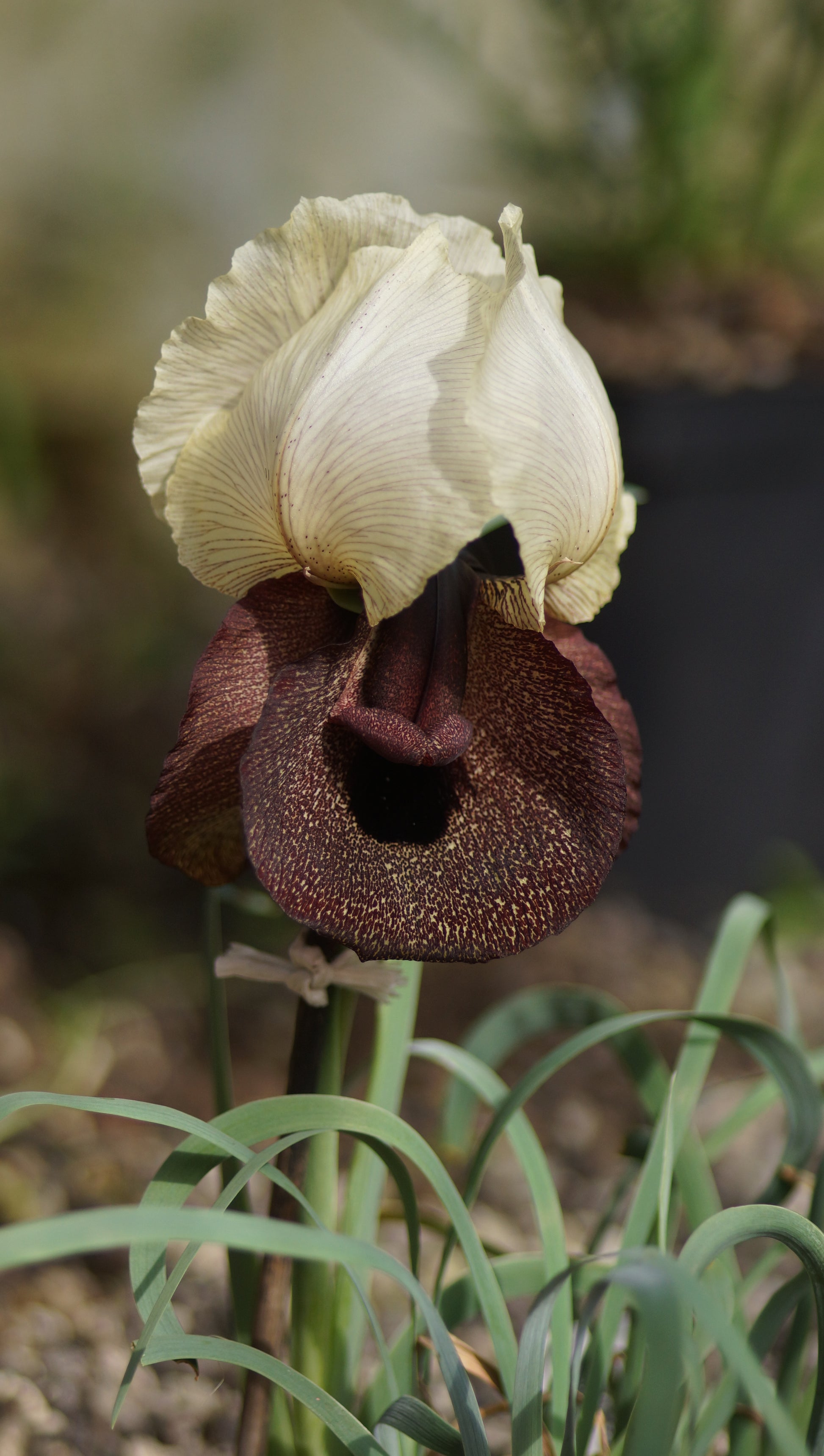 Iris iberica subsp. elegantissima ist eine beeindruckende Vertreterin der Oncocyclus-Iris. Sie stammt aus trockenen Gebirgsregionen im Kaukasus und bildet im späten Frühjahr einzelne, große Blüten mit feiner Zeichnung. Die oberen Blütenblätter sind cremeweiß, die herabhängenden Sepalen dunkel geadert und mit einem markanten dunklen Fleck in der Mitte versehen. Die Pflanzen bleiben mit etwa 20 cm Höhe sehr nieder und ziehen nach der Blüte rasch ein.